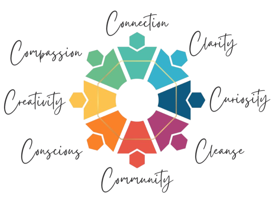 At TKK, we thrive within a constellation of Connection, Clarity, Curiosity, Cleanse, Community, Consciousness, Creativity, and Compassion—the guiding values at the heart of the Patchwork Model™.